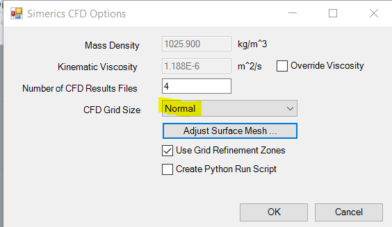 One way to reduce simulation time is to make the CFD grid coarser. By default, the Orca3D Marine CFD template uses the "Normal" grid setting in SimericsMP. This grid setting has been designed to give accurate and reliable results over a wide range of vessel types. (While you will also find "Coarse" and "Medium Coarse" settings in the dialog, our recommendation is that in general these settings only be used as a way to speed up the simulation when you are learning to use the software, for example. They should not be used if you expect to obtain accurate results.)