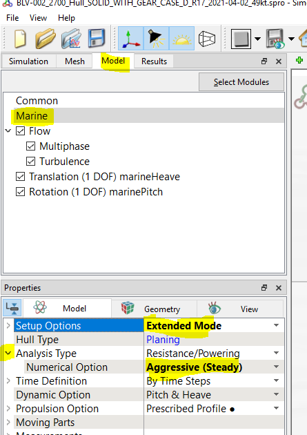 To change to the Aggressive option, click on the Model tab and select the Marine Module. Then in the Properties pane, change from Template mode to Extended Mode. Finally, under Analysis Type, change from Medium (Steady) to Aggressive (Steady). We have found that at times the simulation time and number of time steps that will actually be run differ from what is shown; for this reason, it's a good idea to save the file and then re-open it (the symptom of this is that the simulation will stop before you expected it to; you can just hit the Start button again if this happens).