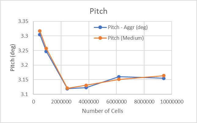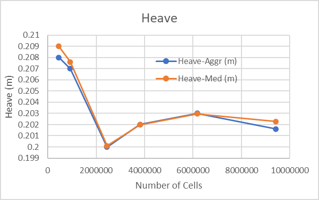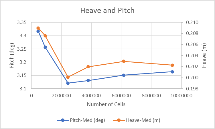 The plot of Resistance data shows that results are converging to a consistent value as the number of cells increases. The same is true for the Pitch and Heave results. These results would confirm that in this example, the Normal grid setting is appropriate.