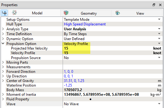 (c) When performing a roll decay with forward speed for a resistance simulation (as opposed to a self-propelled simulation), you will need to manually set the forward speed because the "surge" degree-of-freedom is not a part of the simulation. Instead the vessel forward velocity was prescribed. To set the forward speed, expand the "Propulsion Option" in the Marine module properties, and set the "Velocity Profile" and "Projected Max Velocity" speeds to match the prescribed velocity from the resistance simulation with no roll, as shown below.