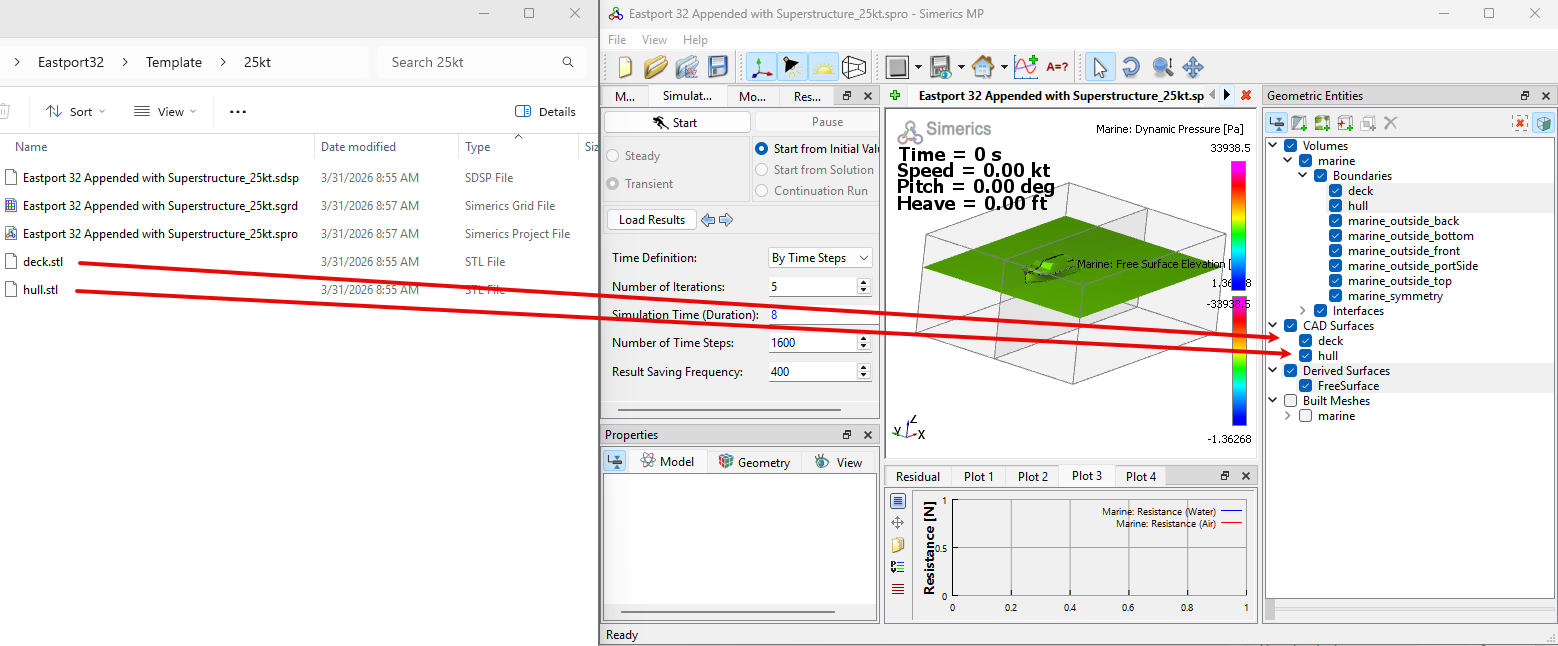 The principal requirement for re-using a SimericsMP simulation as a template is that the number and names of the CAD surface geometry is the same between simulations (although the specific shape of the geometry can change). Orca3D Marine CFD provides the geometric representation of the model to be run in the simulation through STL files. For each "face type" identified in Orca3D through the face attribution process (e.g., hull, deck, transom), a separate STL file is created representing the associated CFD boundary.
