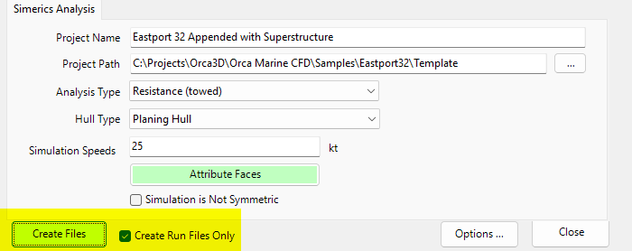 2. Next, for the new geometry to be analyzed, use Rhino and Orca3D Marine CFD to create a new simulation with similar face attribution that was used in the initial simulation. You can use the "Create Run Files Only" option to just create the simulation files but not open the new simulation as shown below. Make sure the Project Path represents a new unused folder.