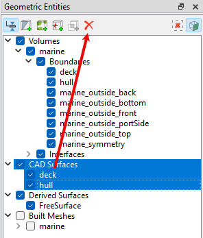 4. Open the .spro file in the "New Geometry" folder in SimericsMP. Then select the CAD surfaces in the Geometric Entities tree and delete them as shown below (these are the original CAD surfaces that were in the template).