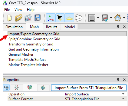 5. The next step is to import the new geometry STL files created from Rhino/Orca3D. In the Mesh panel select the option to "Import/Export Geometry or Grid" as shown below and then select the "Import Surface from STL Triangulation File" button. Locate the new STL files that you copied into the "New Geometry" folder which in this example would include hull.stl and deck.stl files.